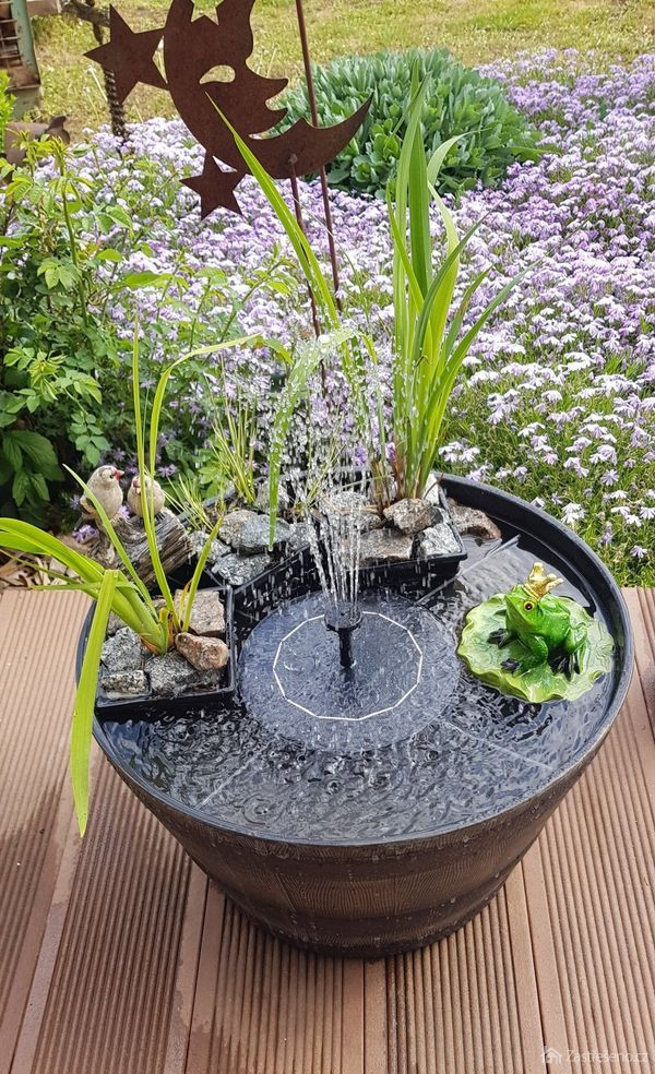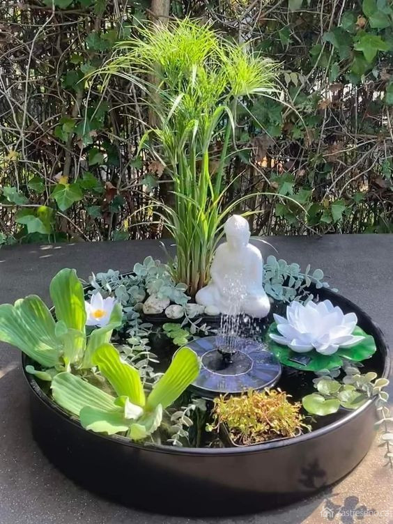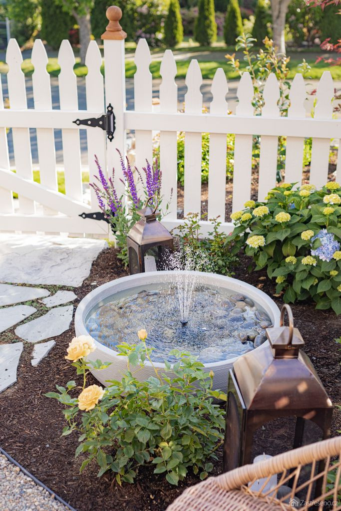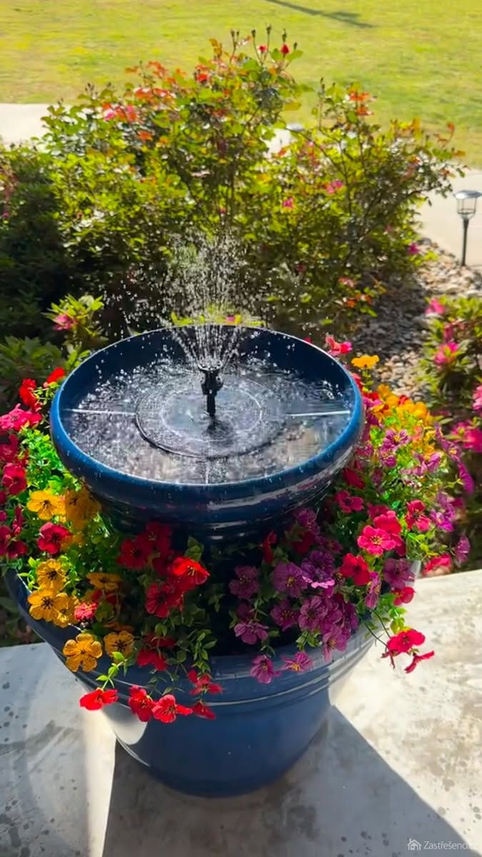 V zahradách nacházíme spoustu kreativních realizací. Například na kraji záhonu se z vyřazené černé kovové židle může stát elegantní fontána – stačí položit mělký terakotový podnos, přidat pár kamínků a do středu umístit solární čerpadlo. Jinde zase v květináči s květinami může zdobit zahradu originální kombinace fontány a květinového aranžmá, kde voda jemně zurčí mezi petúniemi a hledíky. Nebo si představte malou solární fontánu zasazenou mezi trvalky na svahu – voda zde bublá jako malý pramínek, přiláká ptáky, a vy zatím klidně popíjíte kávu na terase.